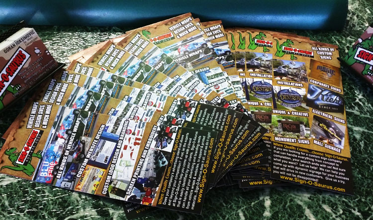 Learn More Contact UsSign-O-Saurus offers all types of paper printing solutions. We specialize in full color digital printing, but for particularly large orders, we also offer offset printing. From business cards, flyers, and invoices to brochures, and full color posters, Sign-O-Saurus has you covered! Paper printing is a relatively inexpensive form of advertising that's equally useful to startups and established businesses alike.
